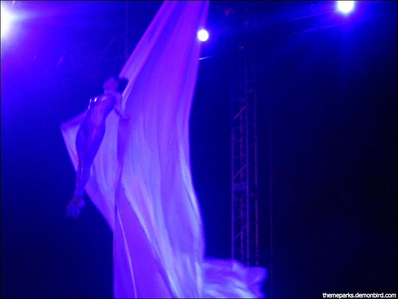 Once free of the cocoon she flies across the stage.